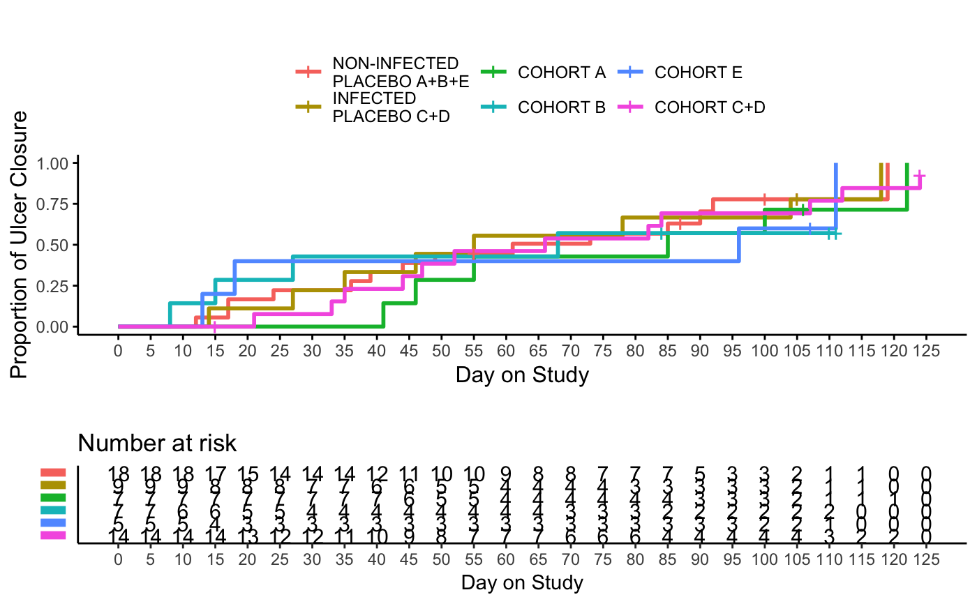 tteplot( data = ATE, group_by = "CHRT", param = "TFUC", reverse = TRUE, xlab = "Day on Study", ylab = "Proportion of Ulcer Closure" )